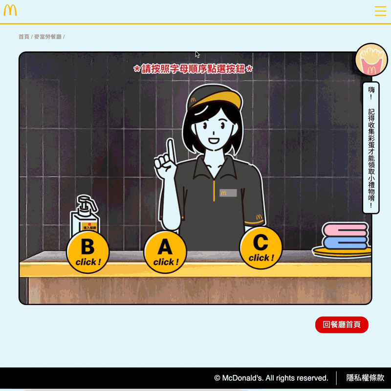看得見的衛生安全,從每位麥胞的日常工作開始,我們設計互動小遊戲「食品安全&品質之旅」。讓消費者邊體驗邊解鎖彩蛋任務,輕鬆了解製程細節,把「安心」這件事變得有趣又有感,留下品牌印象,也提升回訪意願。