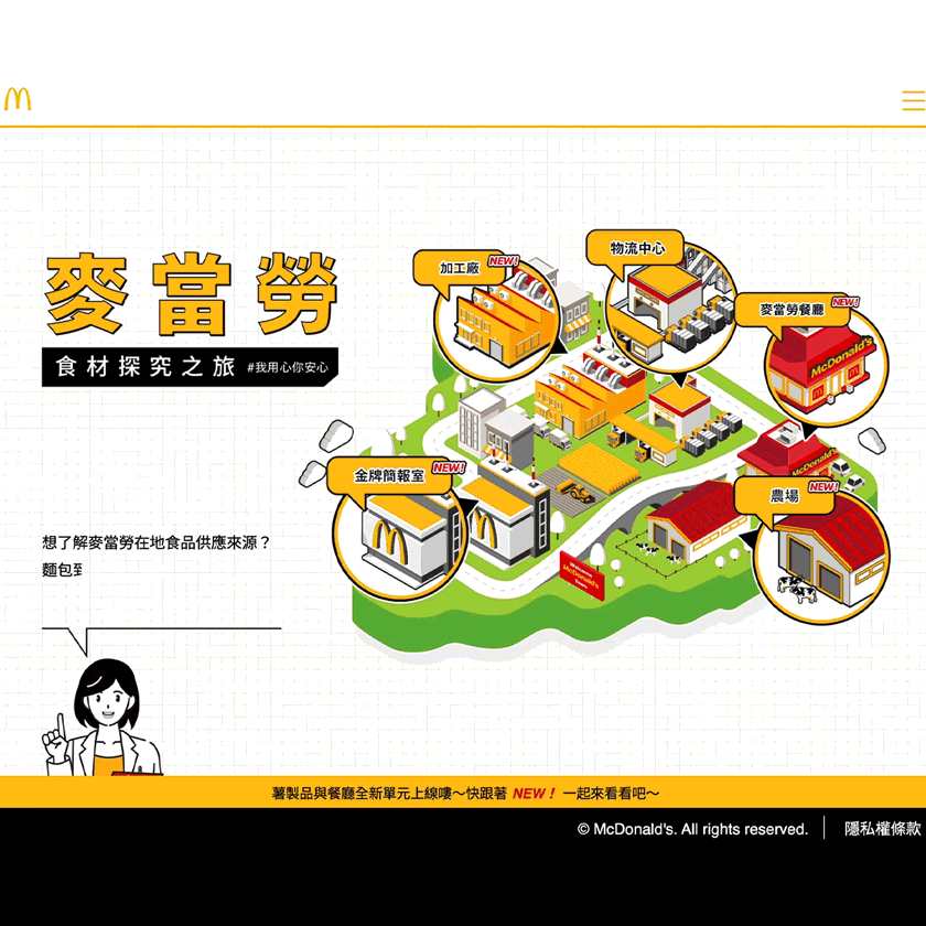 為了確保讓你吃得美味又心安,麥當勞從公開產地來源、履歷認證、新鮮食材現點現做,有我們將複雜內容轉化成一目了然的圖文設計,透過流暢的網頁架構與視覺引導,讓消費者輕鬆理解每一個衛生與安心的細節,資訊公開、脈絡清楚,看得懂,也看得見。
