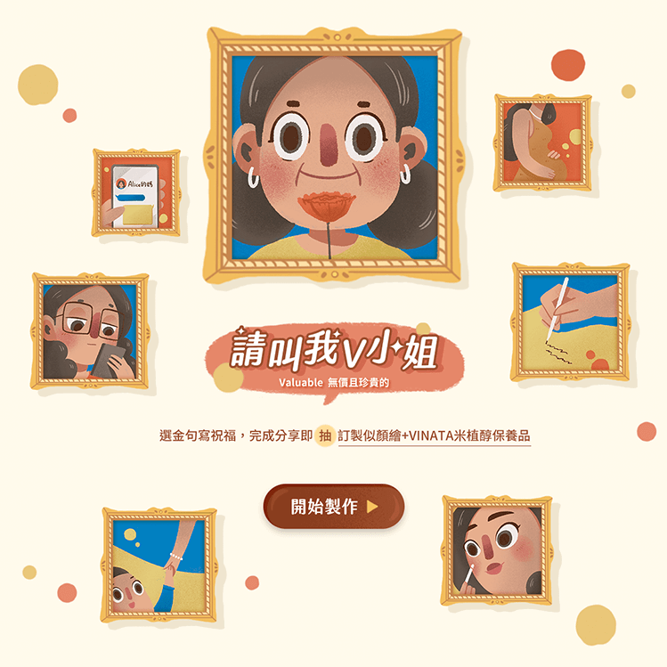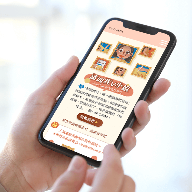 台酒生技 VINATA 推出期間限定活動【請叫我 V 小姐】,以「媽媽的樣子,閃閃發光」為核心精神,邀請使用者在線上製作專屬「V 小姐金句明信片」,寫下對媽媽、對自己、對生命中重要女性的暖心告白。搭配抽獎活動、社群分享機制與鑽石牆曝光區,打造一個情感與品牌價值兼具的互動網站。