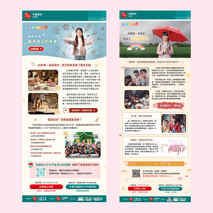 依據真實人物故事設計banner 並引導善心捐款,幫助孩童